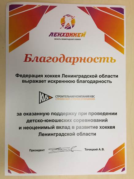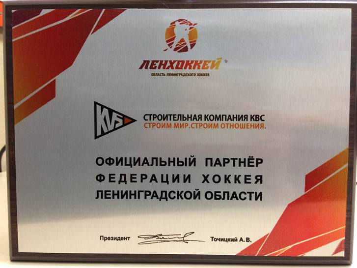 Данное свидетельство ГК «КВС» получила на церемонии завершения хоккейного сезона, прошедшей в СК «Юбилейный» на минувшей неделе. Кроме того, компания получила благодарность за помощь в организации соревнований и вклад в развитие спорта в Ленобласти.
