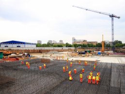 В настоящий момент на площадке комплекса идут активные работы по возведению монолитного каркаса. В южном корпусе «Маяковского» завершается армирование плиты фундамента, и в скором времени планируется выполнить заливку оставшегося бетона.