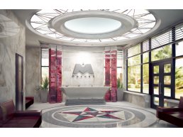 В соответствии с проектом, у дома будет два входа, в которых будут располагаться зоны «ресепшен». Внутренний интерьер этих входов будет исполнен в неоклассическом стиле бежевого и серого цветов с отдельными бордовыми оттенками. Фасад здания будет исполнен в строгом и изящном стиле кофейно-молочных оттенков.