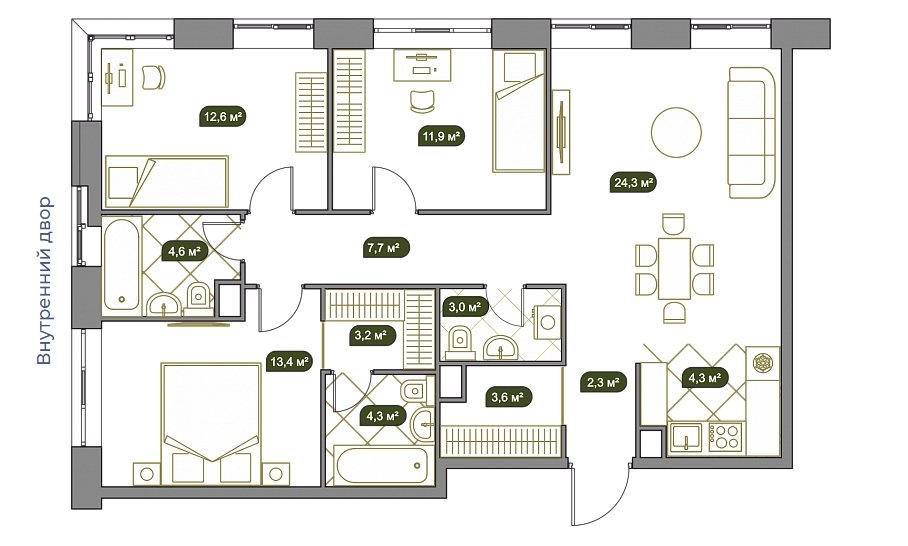 1-комнатные, 2-х комнатные, 3-х комнатные, 4-х комнатные, Пентхаусы -